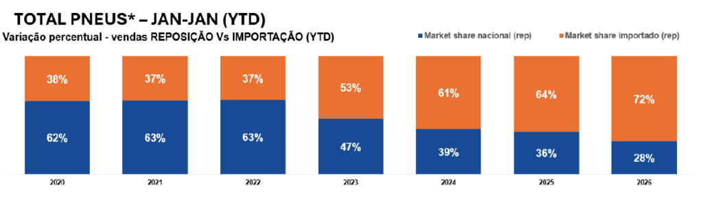 Segundo a ANIP, a participação de pneus de passeio e carga produzidos no país para o mercado de reposição passou de 63%, em 2021, para 41%, em 2025, por conta de condições assimétricas de competição neste mercado. A tendência de queda se aprofundou em janeiro deste ano, quando a participação do produto nacional chegou a inéditos 28% contra 72% dos importados. “Além das medidas tomadas pelos fabricantes, contamos com o urgente apoio do governo para tomar as providências cabíveis de forma a garantir uma competição justa. Caso contrário, corremos o risco de desindustrialização do setor, com impactos severos em outros segmentos, como o da borracha natural, por exemplo, que vende 80% de sua produção para as fabricantes de pneus”, adverte Ricardo Navarro, presidente da ANIP.