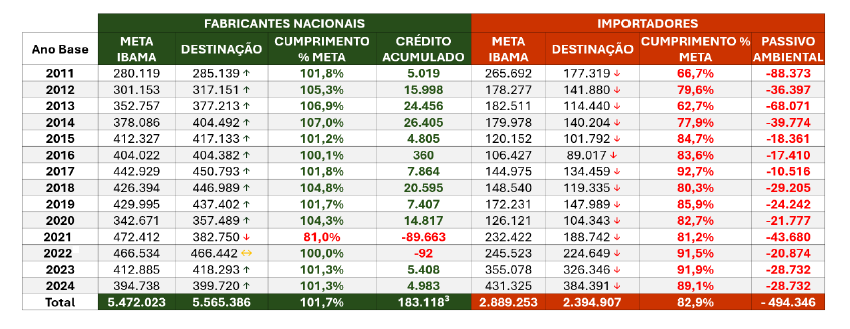 De acordo com a ANIP, com base nos dados do Ibama, entre 2011 e 2024, a indústria nacional cumpriu em 101,7% as metas ambientais estabelecidas, acumulando 183.118m³ de crédito de carbono, com a destinação total de 5,5 milhões de pneus inservíveis. Já os importadores cumpriram somente 82,9% das metas, com destinação de 2,4 milhões de unidades. O passivo ambiental estimado é de 494 mil pneus.