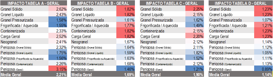 De acordo com estudo feito pelo Instituto Paulista de Transporte Rodoviário (IPTC), os reajustes variam de 0,89% para operações definidas como perigosas na tabela D – em que há a contratação apenas do veículo automotor de cargas de alto desempenho – a 3,15% para o transporte de carga perigosa na tabela A. Os índices consideram as variações de coeficiente de deslocamento (CCD), que passou de R$ 5,913/km para R$ 5,986/km, e do coeficiente de carga e descarga (CC), que teve o custo fixo atualizado de R$ 466,92 para R$ 478,76.